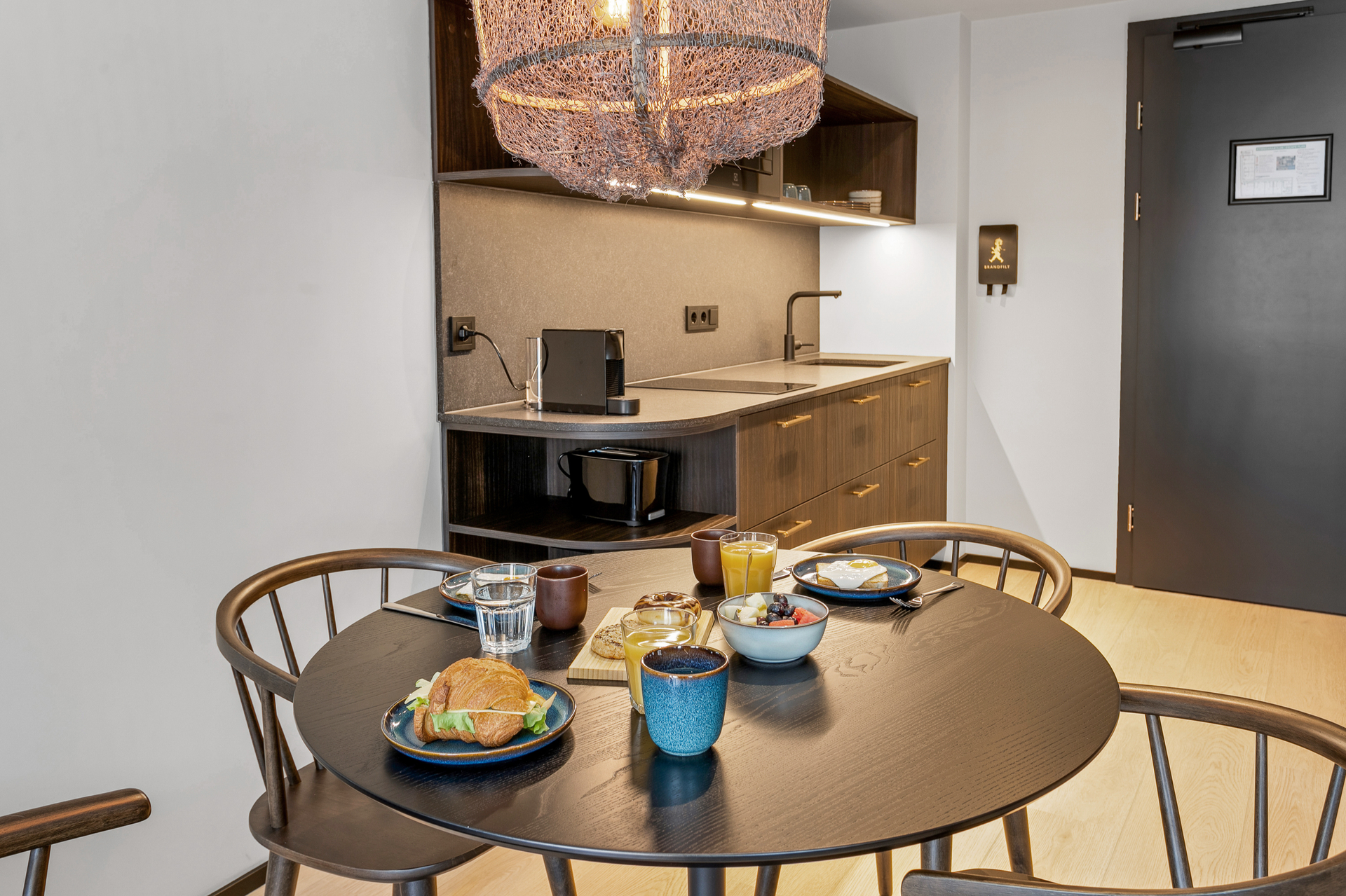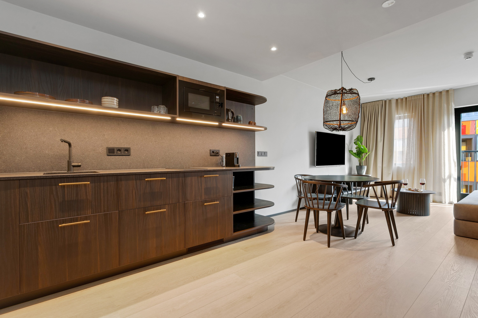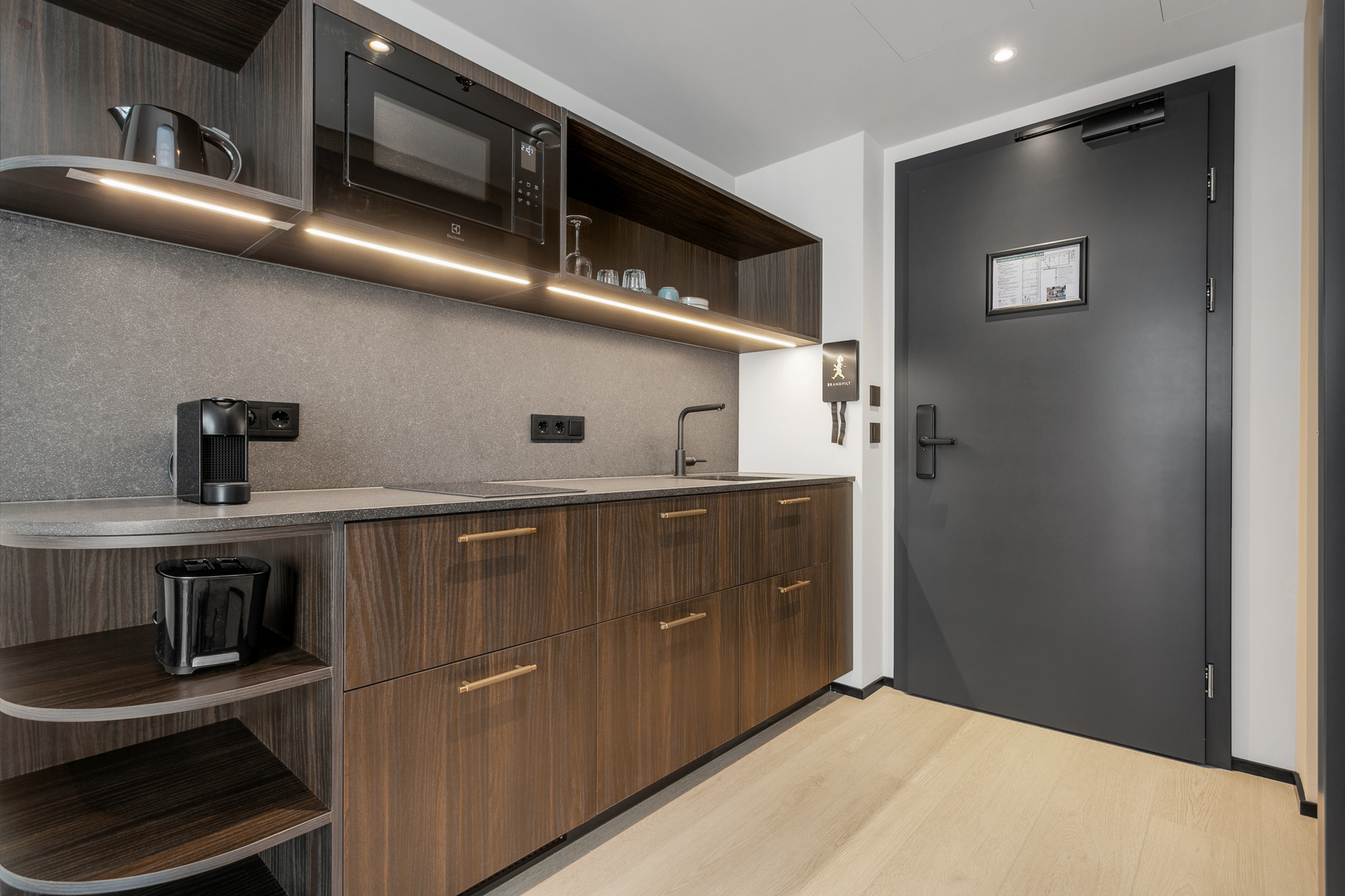 Nútímalegur eldhúskrókur, fullbúinn með helluborði, ísskáp, örbylgjuofni, uppþvottavél, Nespresso kaffivél, katli og brauðrist — allt sem til þarf.