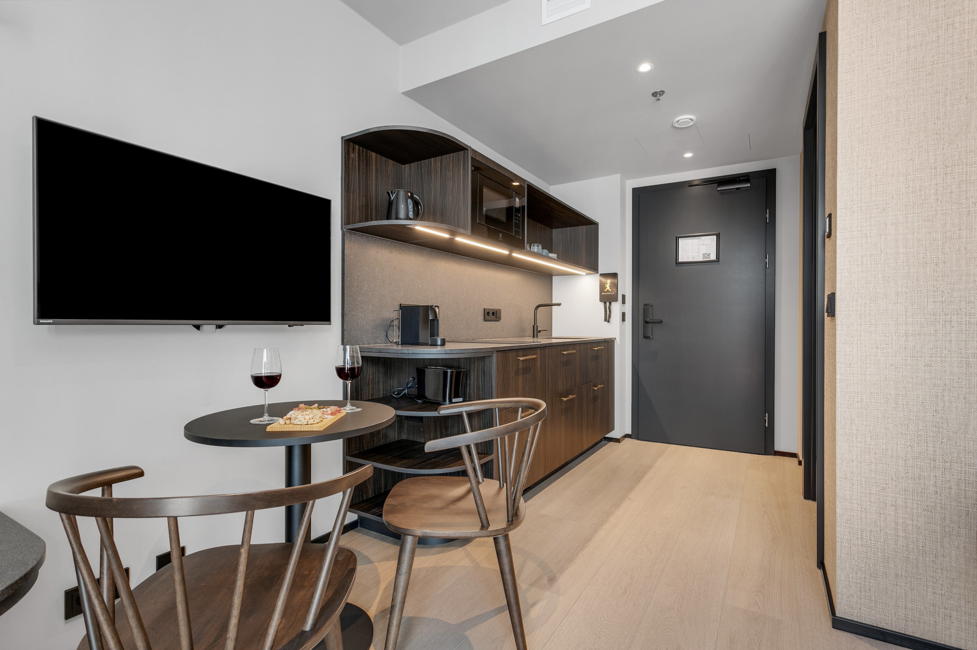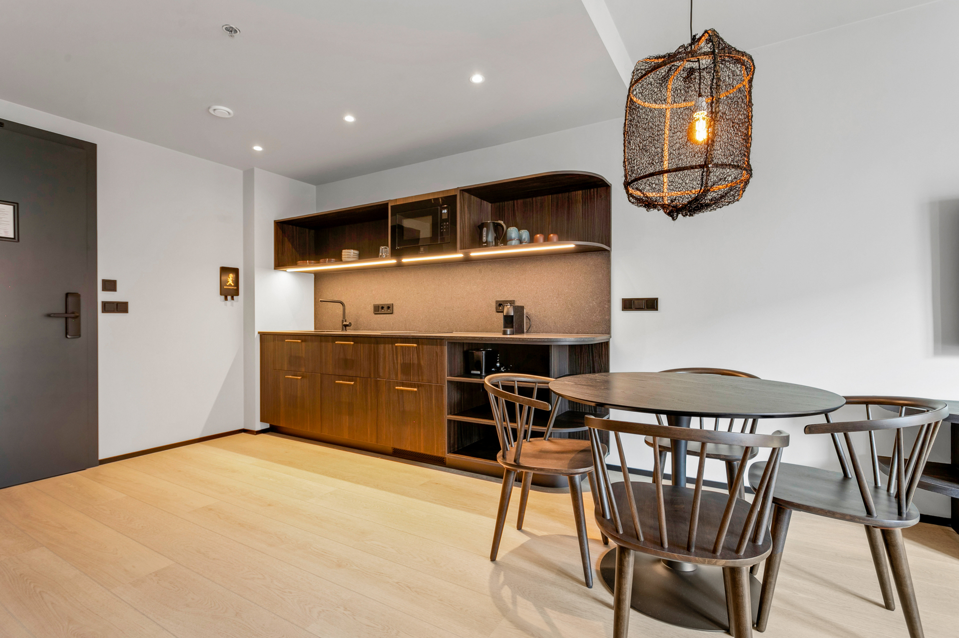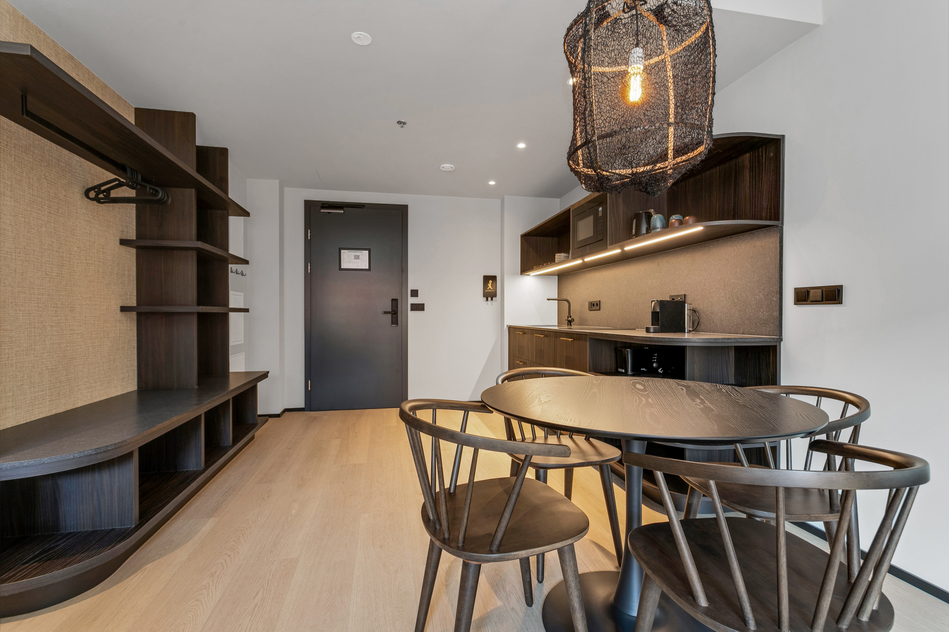 Nútímalegur eldhúskrókur, fullbúinn með helluborði, ísskáp, örbylgjuofni, uppþvottavél, Nespresso kaffivél, katli og brauðrist — allt sem til þarf.