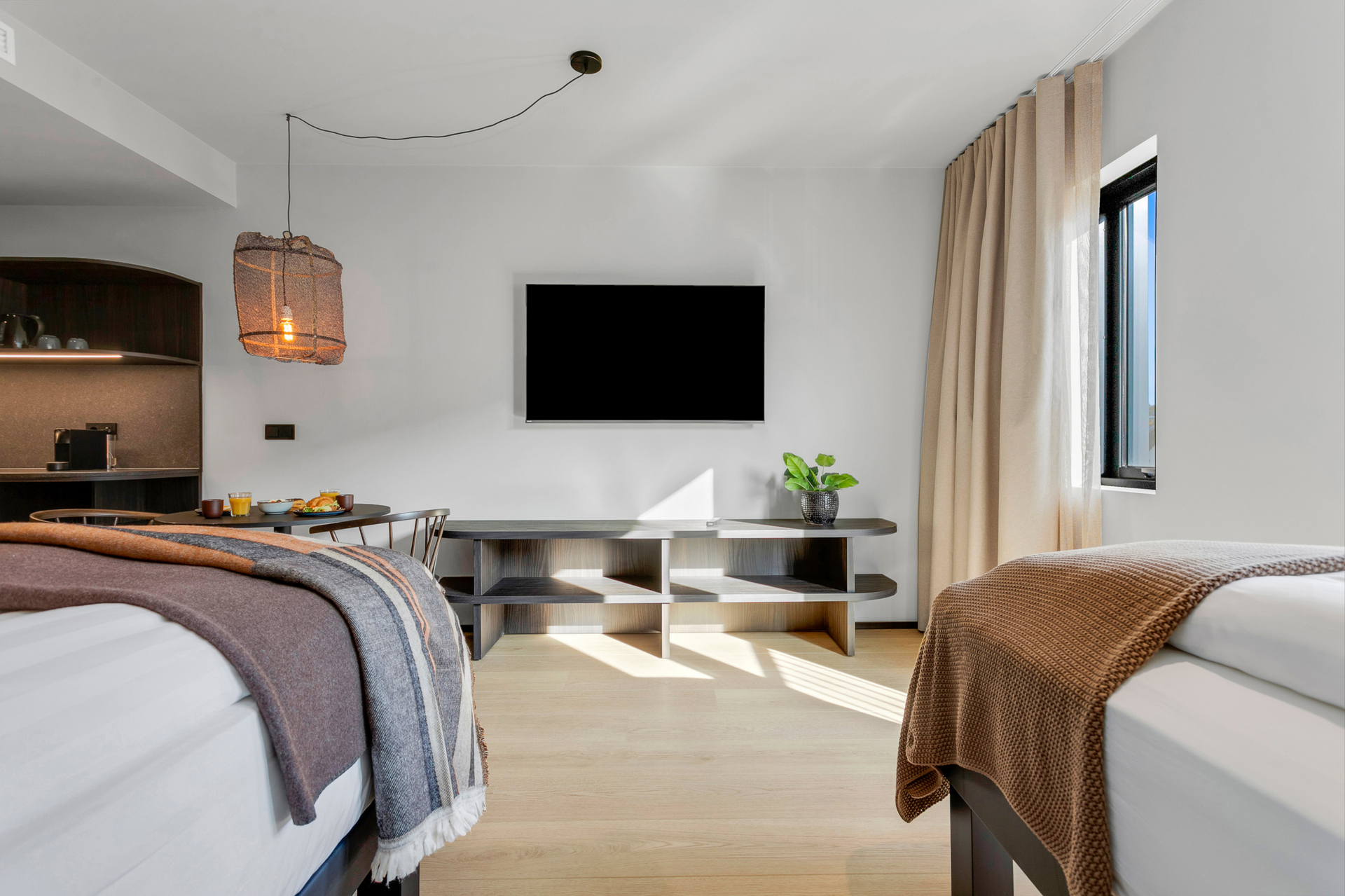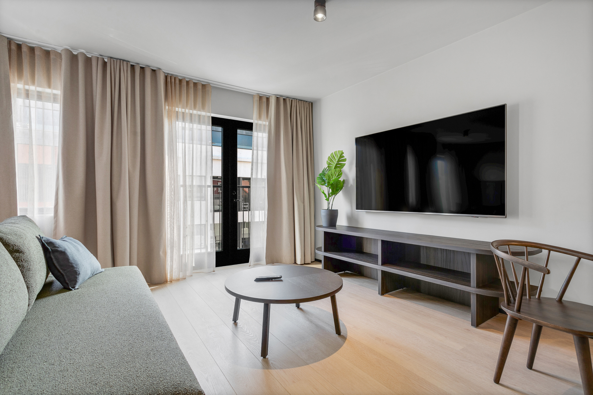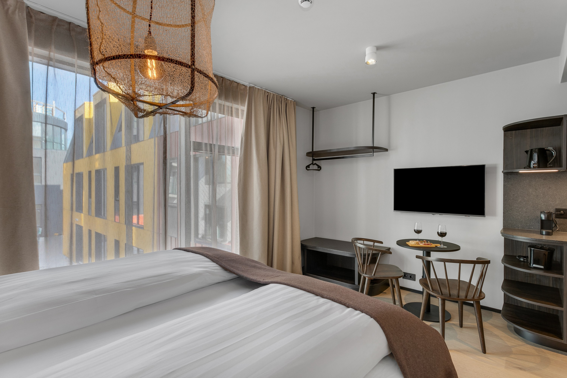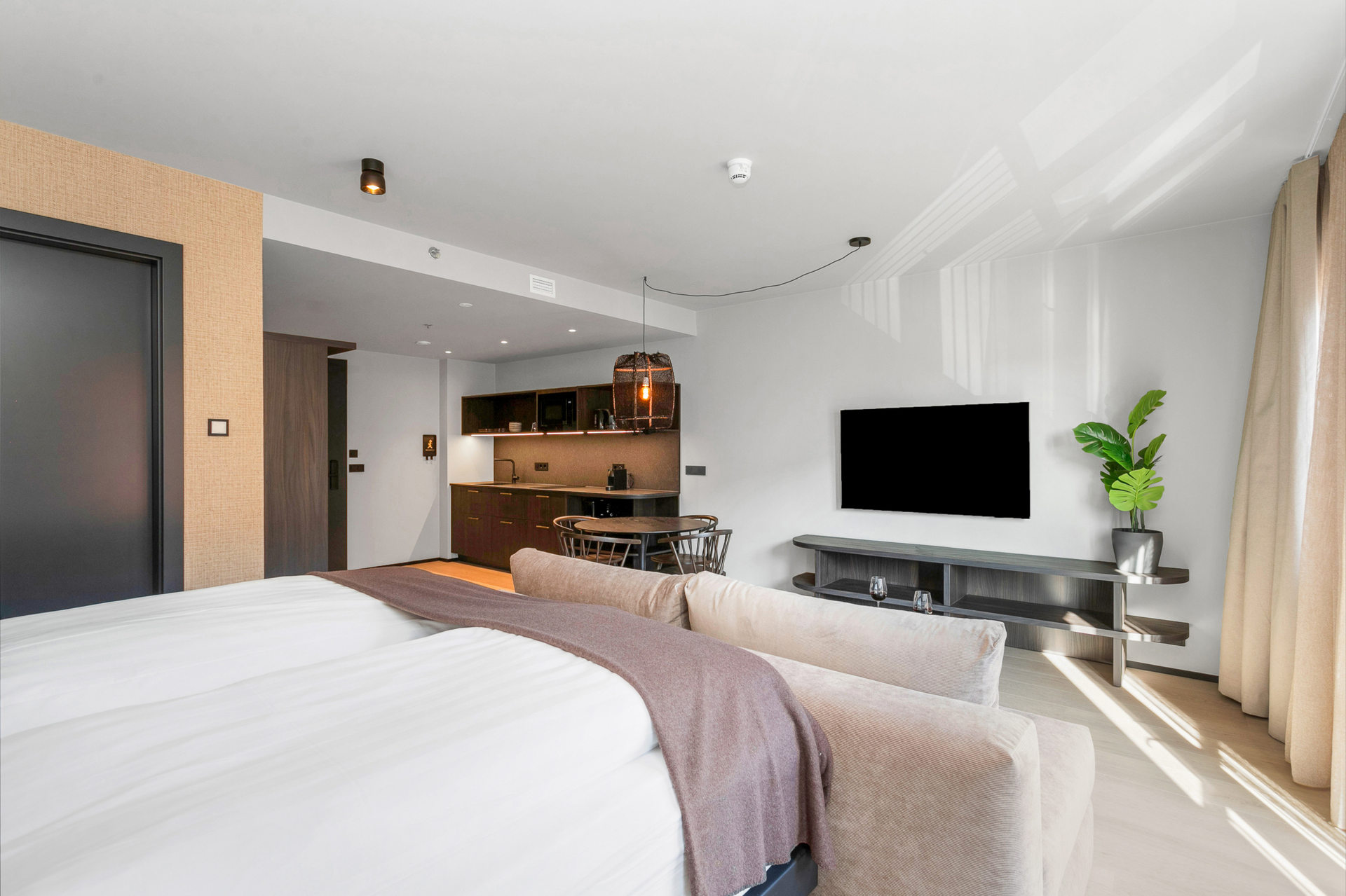 55 fermetra rúmgóð fjölskyldustúdíóíbúð með hjónarúmi, 150 cm svefnsófa og 75 tommu sjónvarpi. Borðstofuborð með sæti fyrir fjóra og stórir gluggar bjóða upp á útsýni yfir heillandi Strandgötuna.