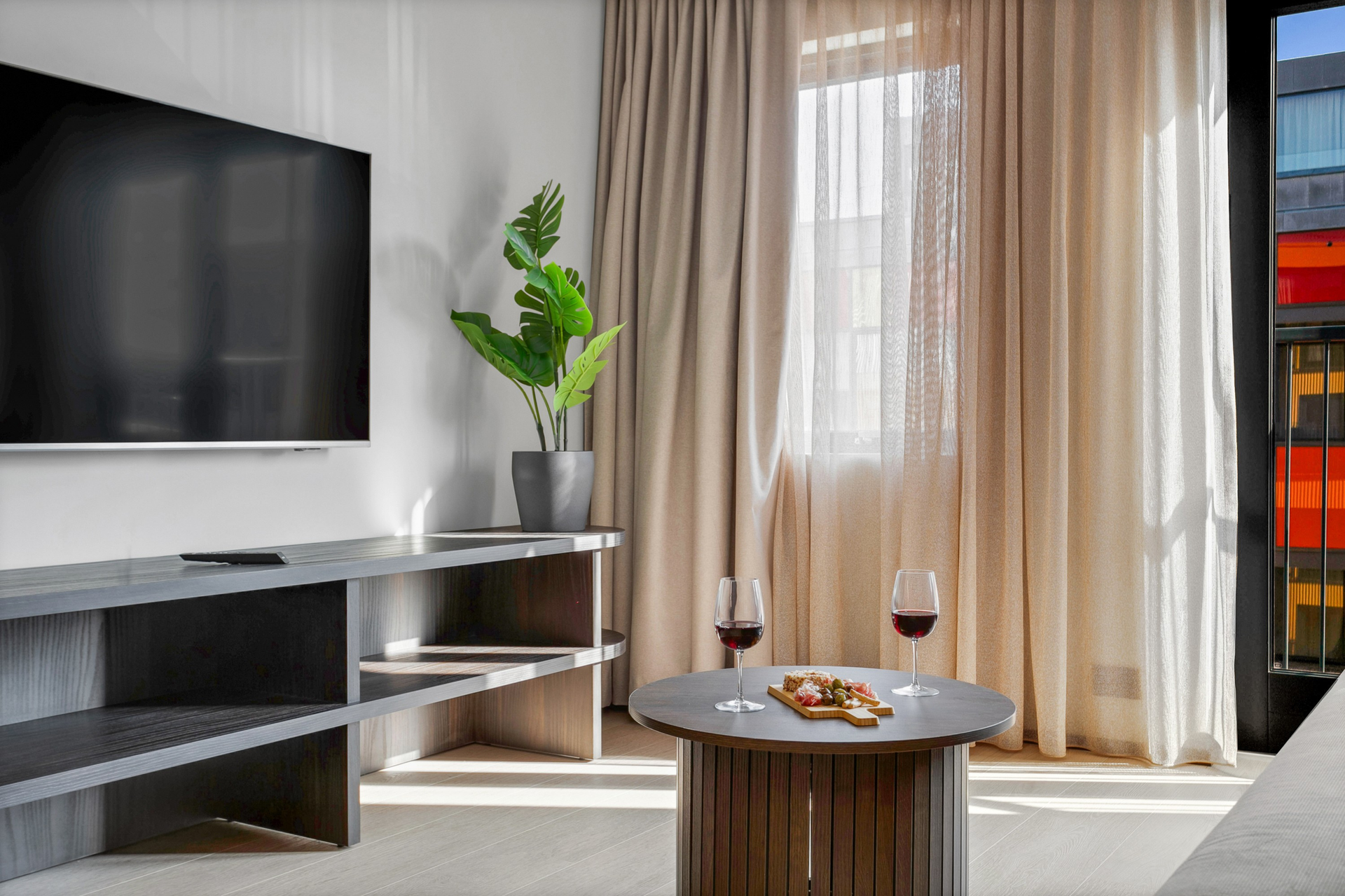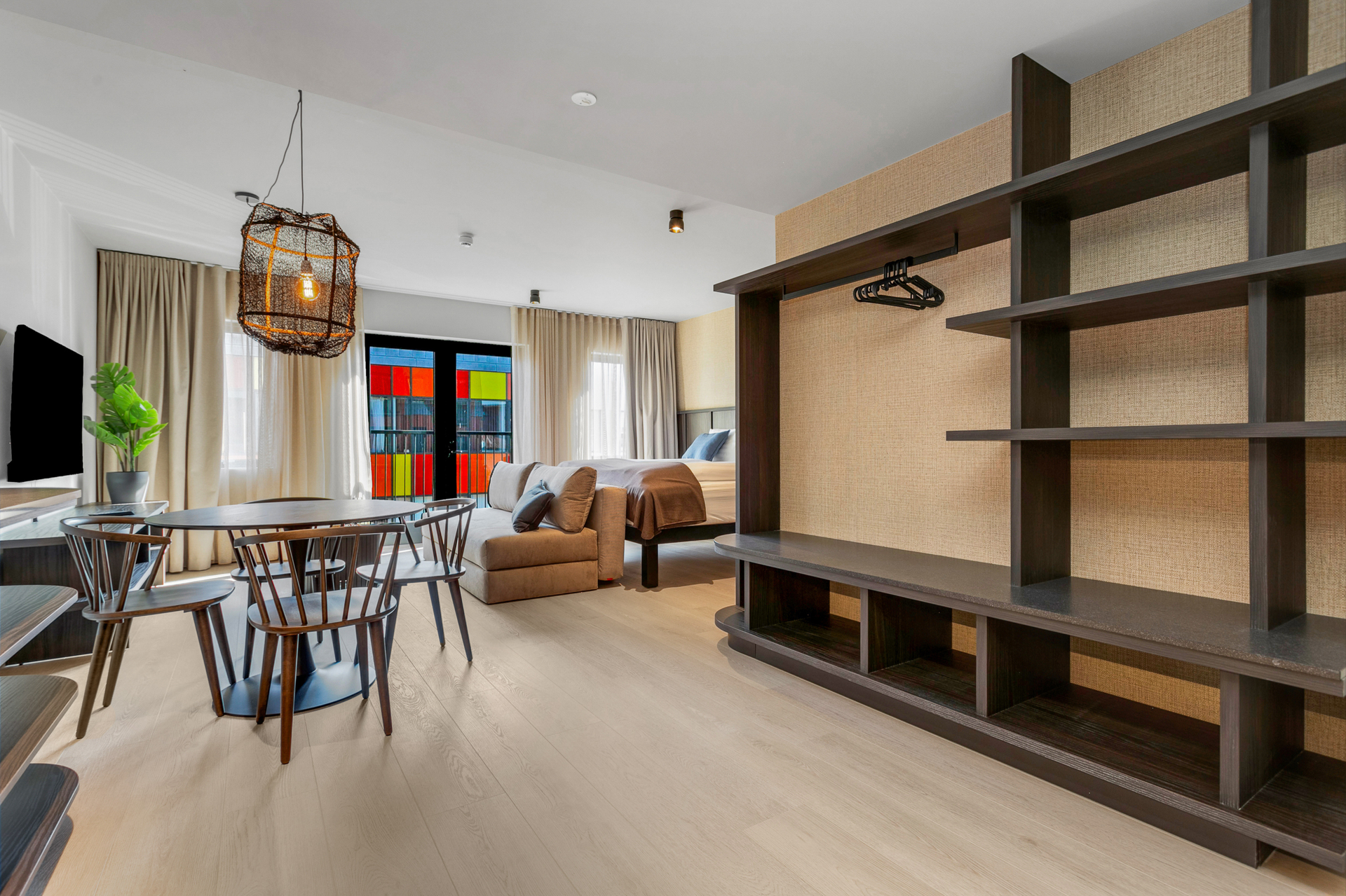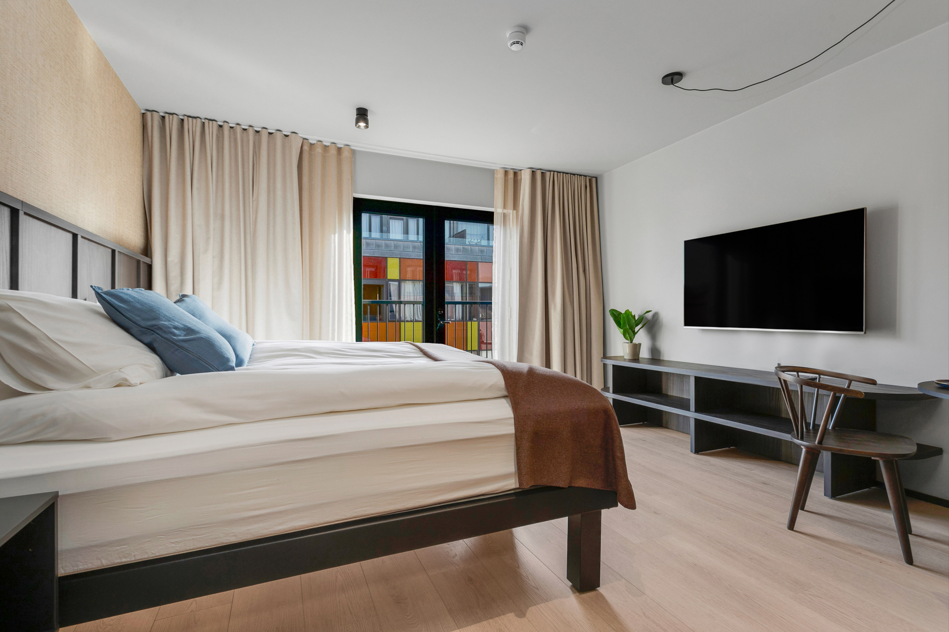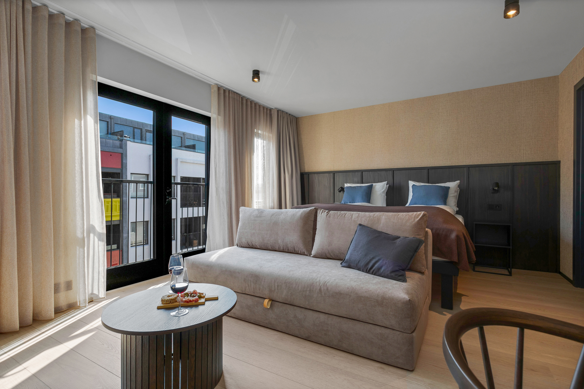 55 fermetra rúmgóð fjölskyldustúdíóíbúð með hjónarúmi, 150 cm svefnsófa og 75 tommu sjónvarpi. Borðstofuborð með sæti fyrir fjóra og stórir gluggar bjóða upp á útsýni yfir heillandi Strandgötuna.