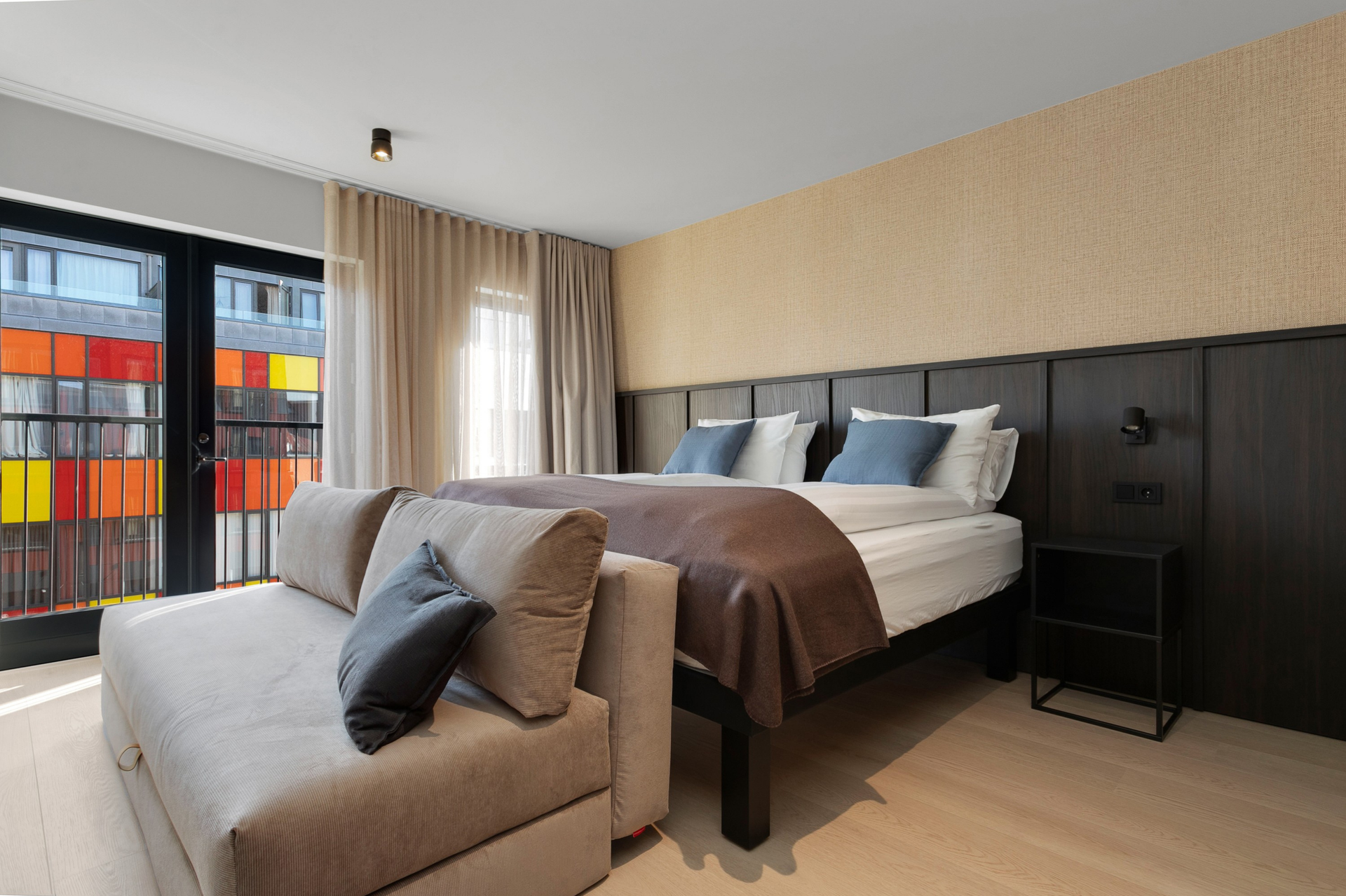 Fjölskylduíbúð, sem er um það bil 45 fermetrar að stærð, með hjónarúmi og 150 cm svefnsófa. Borðstofuborð með sæti fyrir fjóra, fullkomið fyrir fjölskyldumáltíðir eða til að skipuleggja næsta ævintýri. Njóttu útsýnis yfir Strandgötuna.